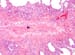 Medium-power photomicrograph (original magnification, X10; hematoxylin and eosin stain) demonstrates a fibrotic interlobular septum containing a vein with an occluded lumen (arrowhead). The occlusion is composed of dense, collagen-rich, fibrous tissue. Image courtesy of Thoracic Imaging Section, Department of Radiologic Pathology, Armed Forces Institute of Pathology.