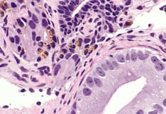 Adenocarcinoma of the prostate. Note the atypical hyperchromatic epithelium lining the glands and the pleomorphic nature of the malignant cells.